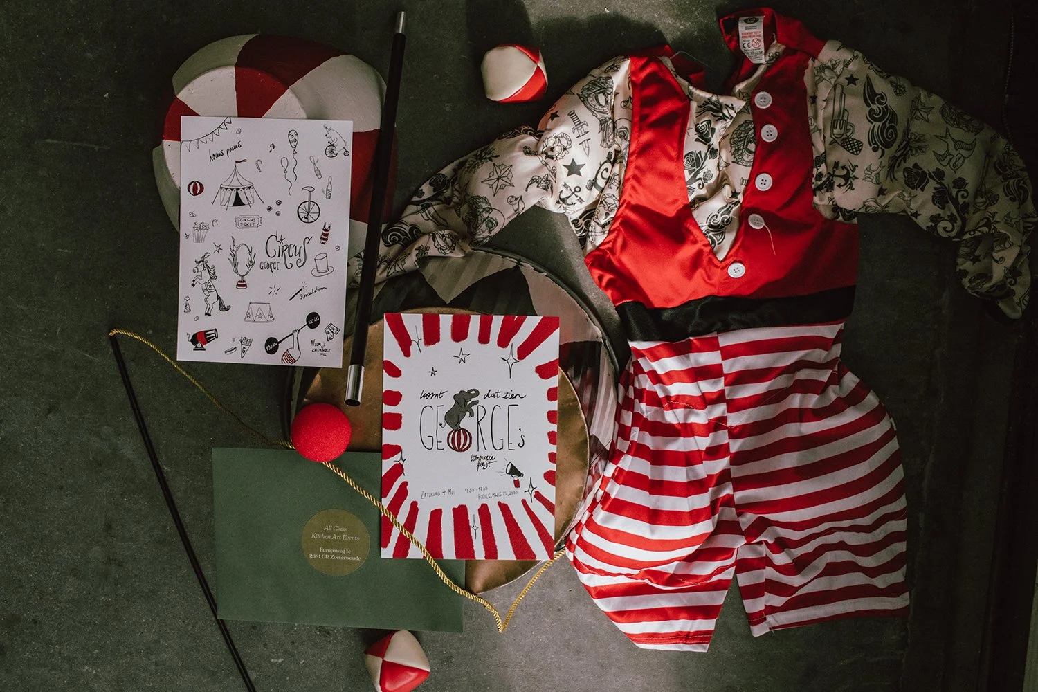 Voor het communiefeest van George ontwikkelde Studio Reizevoort een circus met speciale uitnodigingen, een welkomstbord bij de entree, foodstands en een drankenmenu voor bij de bar. Een origineel totaalpakket, helemaal in stijl en op maat gemaakt.